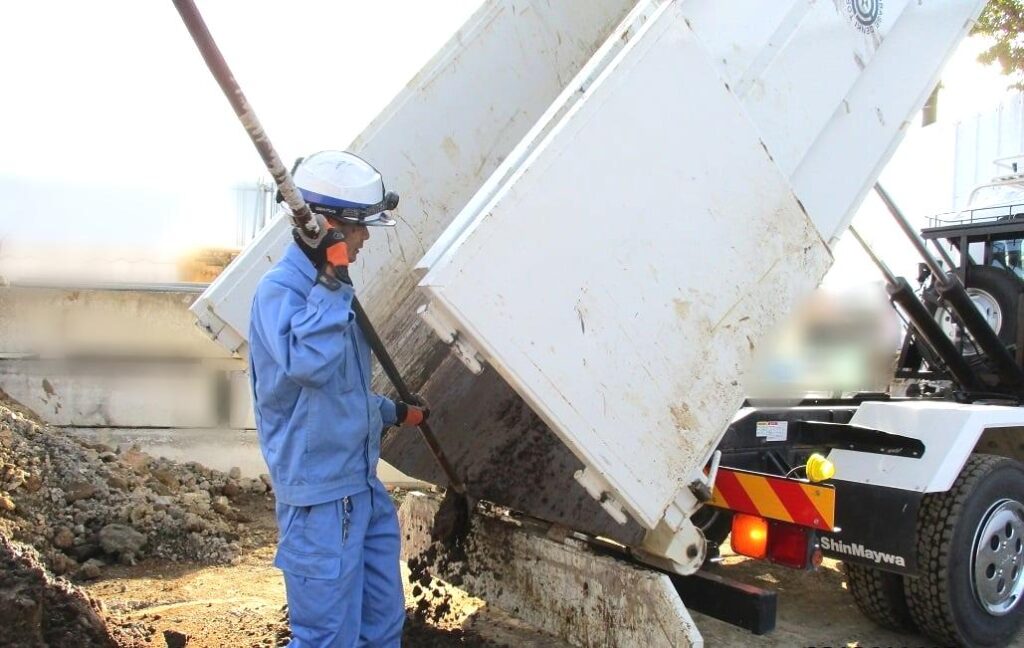 コンテナについた泥を専用の工具を使用し丁寧に取り除きます。